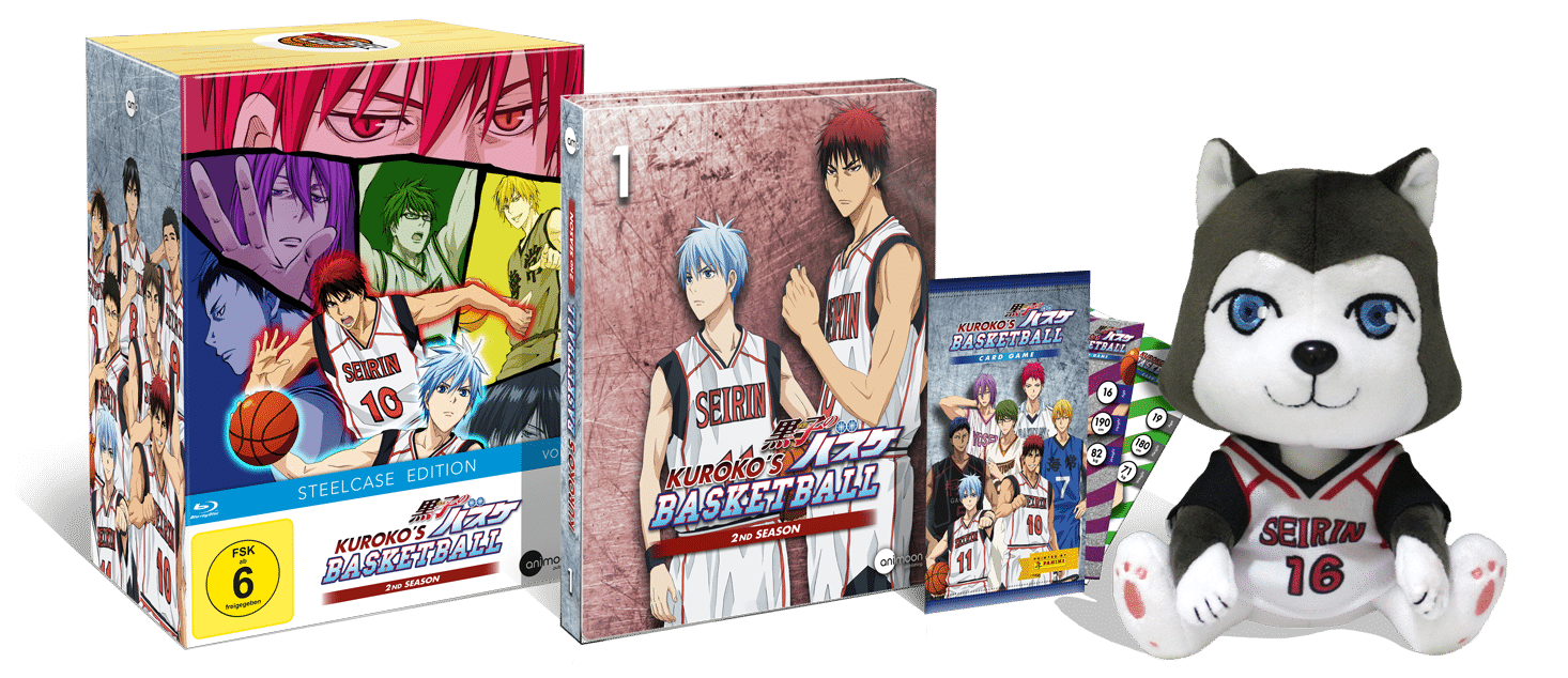 Auch Volume eins der zweiten Kuroko’s Basketball-Staffel soll nach aktuellem Stand ab dem 25. Juni 2021 erhältlich sein, das die ersten fünf Episoden mit deutscher und japanischer Sprachausgabe umfasst. Als Extra gibt es neben einem Sammelschuber zwei PANINI-Sammelkarten sowie Tetsuya Nr. 2 als Plüschtier.