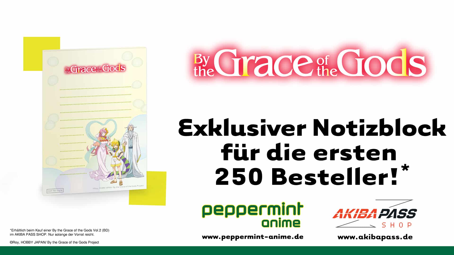 Zudem spendiert das Münchener Anime-Label dem Fantasy-Anime einen auf 500 Exemplare limitierten Sammelschuber, der exklusiv im AKIBA PASS SHOP zusammen mit einem Volume nach Wahl bestellt werden kann. Ebenfalls im Online-Shop erhalten die ersten 250 Besteller ein Poster zum ersten Volume sowie einen Notizblock zum zweiten Volume als kostenloses Goodie.