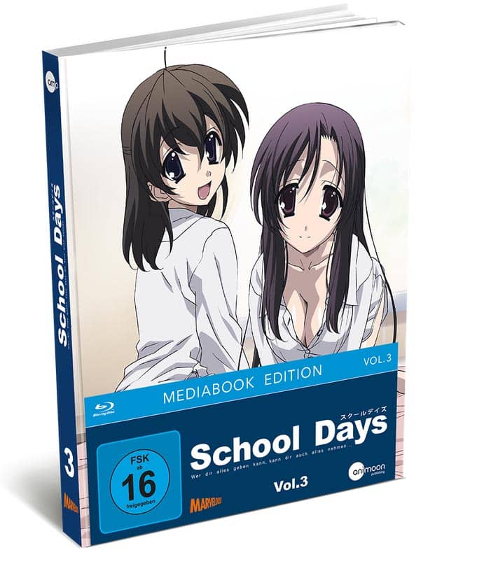 Demnach erscheint School Days in drei Volumes, wobei das erste Volume voraussichtlich am 30. April 2021 als Mediabook-Edition mit Sammelschuber in den Handel kommt. Dieses beinhaltet die ersten vier Episoden mit deutscher und japanischer Sprachausgabe sowie Extras, die später enthüllt werden. Fortgesetzt wird die Serie mit dem zweiten Volume am 11. Juni 2021 und abgeschlossen mit dem dritten Volume, das auch die OVA enthält, am 9. Juli 2021. Der komplette Drama-Anime kann im Online-Shop von AniMoon vorbestellt werden.