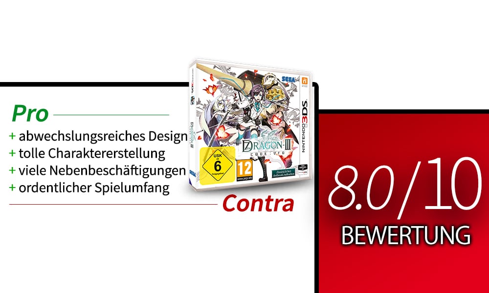 7th Dragon III Code: VFD ist ein weiteres gelungenes JRPG, das für den nun schon sechs Jahre alten Nintendo 3DS erschienen ist. Eine spannende Story mit vielen Wendungen, einer Vielzahl an verschiedenen Charakterklassen und ein innovatives rundenbasiertes Kampfsystem machen 7th Dragon III Code: VFD zu einem Geheimtipp für JRPG-Fans. Überraschend waren auch die prominenten Synchronstimmen. Anime-Fans werden zahlreiche Stimmen wiedererkennen und somit beinahe mit ihren Lieblingscharakteren zusammen in die Schlacht ziehen können. Einziges Manko sind die englischen Texte und die teilweise gestreckt wirkenden Level, die mir persönlich zu wenig Raum für alternative Wege lassen. Wer darüber hinwegsehen kann, wird mit 7th Dragon III Code: VFD weit über 40 Stunden lang an den Nintendo 3DS gefesselt sein.