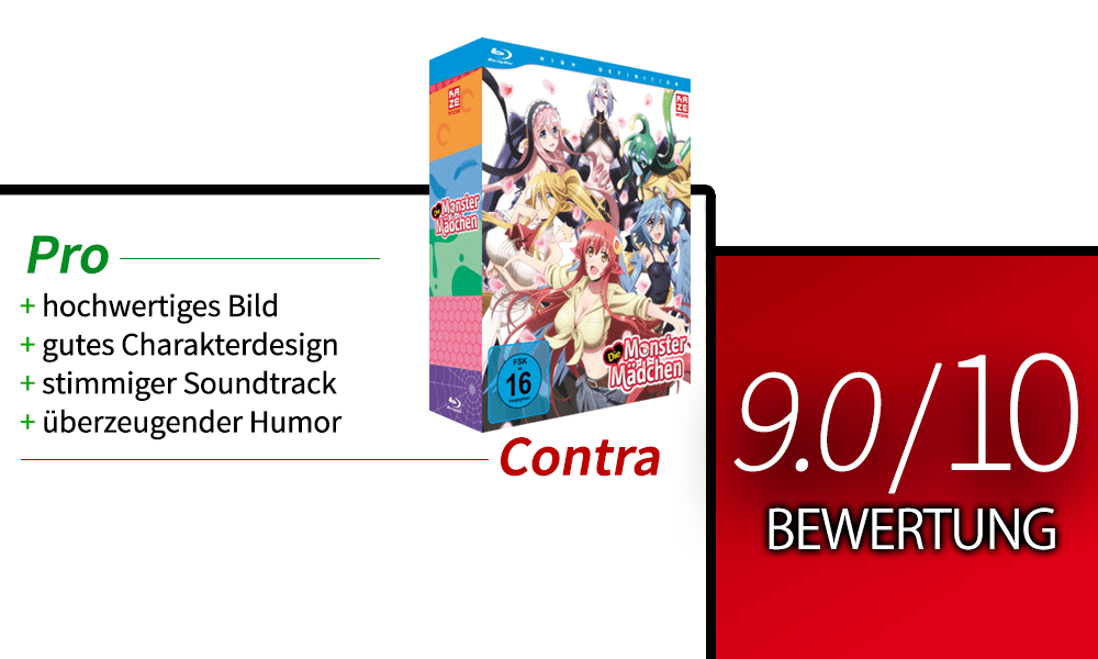 Die erste Staffel des Animes Die Monster Mädchen konnte mich komplett überzeugen. Die Bilder sind scharf, knackig und farbenfroh und trotzdem sehr ausgeglichen. Die Soundtracks sind passend und sowohl das Opening als auch das Ending konnten überzeugen, wobei mir das Opening besonders gut gefallen hat. Das Charakterdesign der Monster Mädchen überzeugt und ist gewollt auffälliger als das der anderen Charaktere, um den Fokus auf diese zu richten. Die deutsche Synchronisation ist in diesem Anime besonders gut gelungen, sie ist sehr ausdrucksstark und die Stimmen passen hervorragend zu den einzelnen Charakteren. Die Story ist simpel und die Handlungsstränge sind abwechslungs- und actionreich. Der Anime startet direkt durch und zeigt starken Ecchi-Humor. Die Charaktere sind zwar gewollt sehr naiv, gewinnen aber dennoch im Laufe der Handlung immer mehr an Tiefe. Der Anime Die Monster Mädchen bleibt bis auf einen kurzen Moment durchgehend sehr humorvoll, abwechslungs- und actionreich – und auch sehr anzüglich. Damit wird der Anime seinem Genre vollkommen gerecht und kann fast durchgehend überzeugen. Ich hoffe auf eine zweite Staffel und euch darüber berichten zu können.