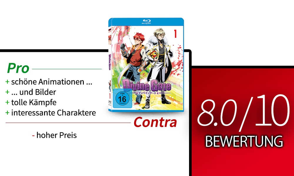 Generell muss ich sagen, dass mich das erste Volume von Divine Gate schon ein wenig an die Story gefesselt hat. Leider sind in diesem nur drei Folgen enthalten, in denen noch nicht einmal wirklich viel geschieht. Man kann noch nicht absehen, in welche Richtung sich der Anime letztendlich entwickeln wird. Ansonsten gibt es nur kleinere Sachen auszusetzen, wie die überhäuften Kampfanimation. Der Rest gefällt mir nichtsdestoweniger gut und macht mich heiß auf die weiteren Volumes; das zweite wird bereits am 26. Mai erscheinen. Besonders überzeugt haben mich die Charaktere und das generelle Bild und die Animationen des Animes. Dazu finde ich den Preis von knapp 30 Euro für drei Folgen noch ein wenig hoch. Ich kann dieses Volume auf jeden Fall allen Leuten empfehlen, die Lust auf spannende, actiongeladene Kämpfe und coole Charaktere haben.