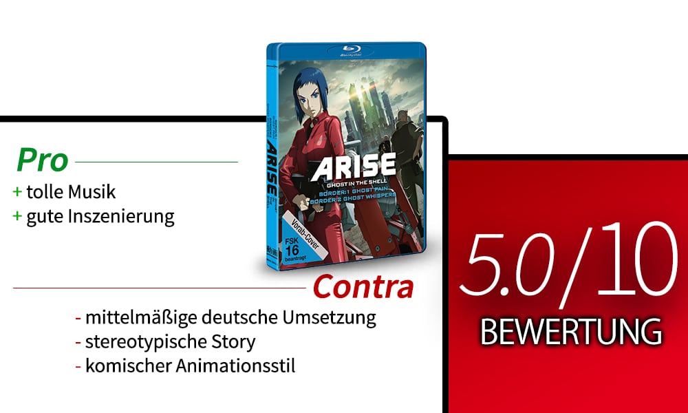 Mir haben, um ehrlich zu sein, die ersten zwei Border von Ghost in the Shell: Arise nicht gut gefallen. Es gab zu viele Punkte, die mich störten. Zum einen war es der stereotypische Aufbau der Story, den es leider schon hundertmal deutlich besser gab. Des Weiteren gibt es den gewöhnungsbedürftigen und sehr eigenen Animationsstil, den man aber dennoch wirklich gut finden kann, da das Geschmackssache ist. Genau das Selbe gilt für die Synchronsprecherauswahl, die subjektiv sehr verschieden bewertet sein mag. Dafür hat mir aber das Erzähltempo recht gut gefallen und die Inszenierung war auch auf einem guten Level. Am Besten hat mir aber die Musik gefallen, die jede Art von Szene wundervoll unterstrichen hat.