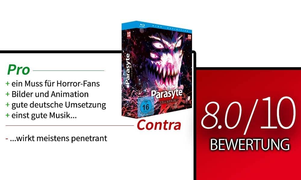 Bevor wir das erste Volume mit den ersten sechs Episoden von Parasyte – The Maxim erhalten haben, habe ich den Anime noch nie gesehen. Ich habe nur von den ein oder anderen Leuten vernommen, dass es ein sehenswerter Horror-Anime mit einer überwiegend guten Geschichte sei. Doch nach der ersten Folge hat mich der Anime einigermaßen überzeugt und wollte auf jeden Fall mehr sehen. Leider gibt es Szenen, die wie ein Filler wirken und die eigentliche Geschichte sich eher im Hintergrund befindet. Nichtsdestoweniger schafft man es, den Zuschauer zu unterhalten – egal ob mit Humor oder kitschiger Romantik. Die Bilder waren sehenswert und die Animationen waren besonders in den Kampfszenen gut zu beobachten. Die deutsche Umsetzung war annehmbar, die musikalische Untermalung gibt den Episoden den letzten Schliff, auch wenn einige Musikstücke aufdringlich wirken. Ich bin gespannt, wie die Geschicht fortgeführt wird und freue mich schon sehr auf das zweite Volume von Parasyte – The Maxim.