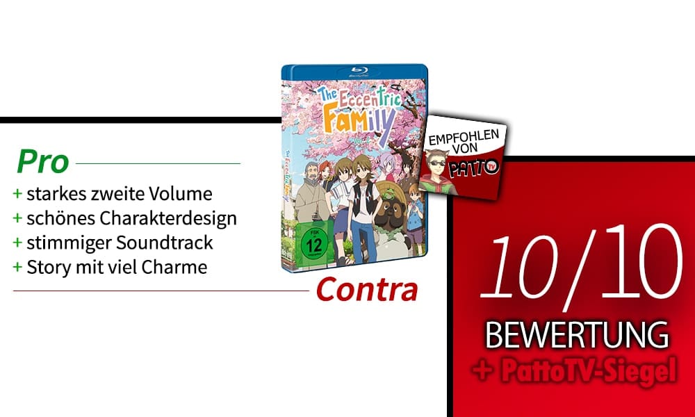 Ein wirklich ausgesprochen guter und hochwertiger Comedy-Anime und ein überaus starkes zweites Volume. Insgesamt schafft es der Anime durch seine großartige Story mit viel Charme und einem überaus gutem Bild zu überzeugen. Dabei ist The Eccentric Family sehr empfehlenswert.